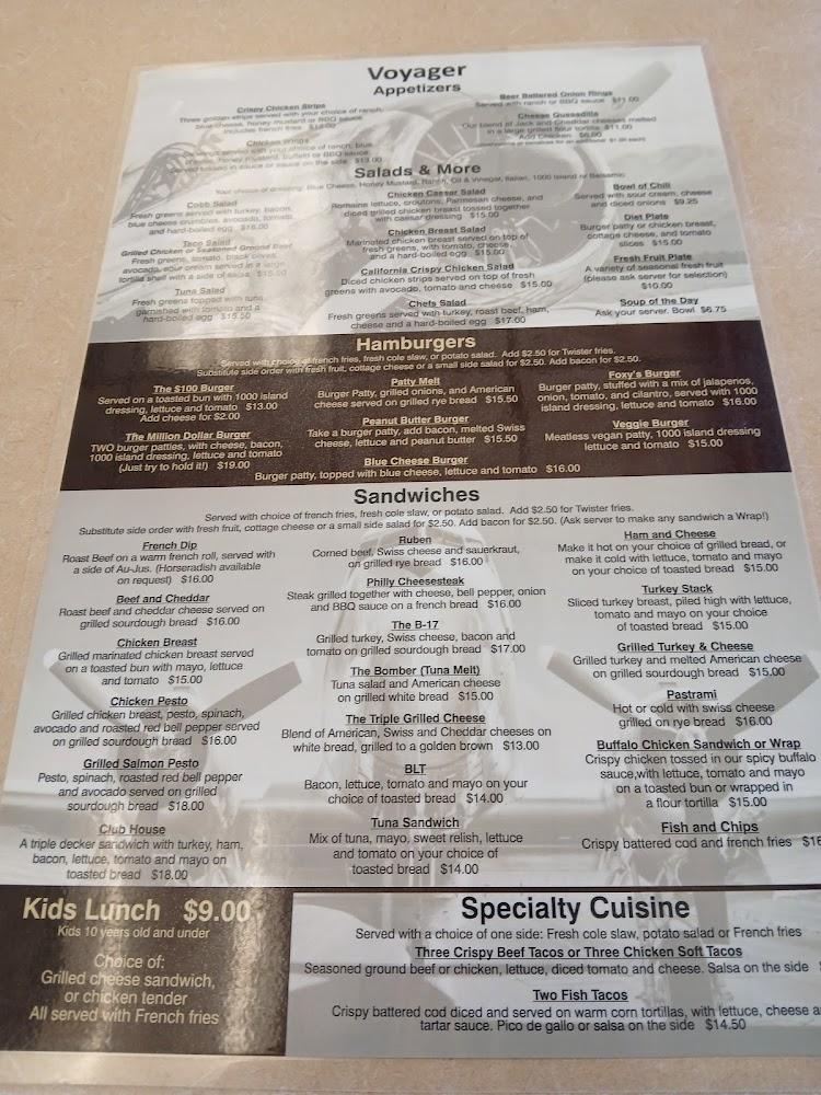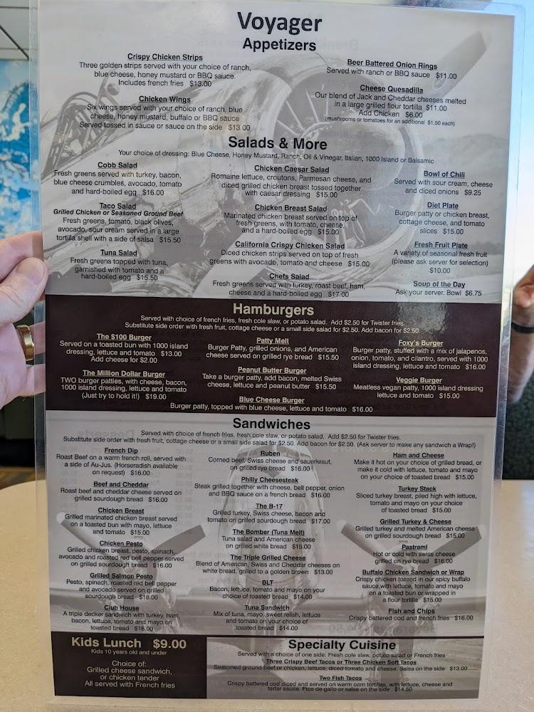 The menu at Voyager Restaurant features classic American diner food with a twist. Breakfast items include fluffy pancakes, hearty omelets, and creative interpretations like the 'Ultimate Eggs Benedict'. For lunch, expect a selection of burgers often praised for their flavor.