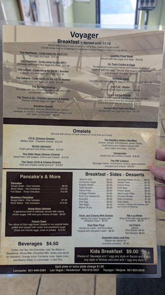 Welcome to Voyager Restaurant, where aviation meets casual dining! Located at 1434 Flight Line in Mojave, CA, our inviting eatery offers a delightful menu of simple American dishes for breakfast, lunch, and dinner. Enjoy a meal with stunning views of planes taking off and landing, creating a unique experience for aviation enthusiasts and food lovers alike. With amenities like takeout, delivery, and ample wheelchair access, we cater to all guests. Savor our excellent coffee and relax in a calm, historic atmosphere. Join us for a memorable dining experience that combines delicious food with the thrill of flight!